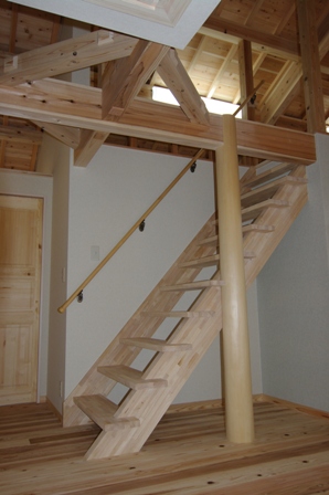 | 木の家がいいという事でMIタウンさんに決めました。又、「古い物を大事に」という考えにも共感しました。自然の中で子供を育てたいという思いから、この場所に決めました。日当りがあまり良くない立地条件でしたが、ロフトの天窓と東側の窓が光を運んでくれ、明るい家になりました。木の色合いも室内を明るくしてくれます。梁が見える高い天井も開放的でリビングが広く見え、風通しもすごくいいです。生活していく中で、子供が梁にさわって遊んだり、使い方を考えていくのもすごく楽しみです。家の外も中も自然がいっぱいです。 |