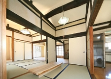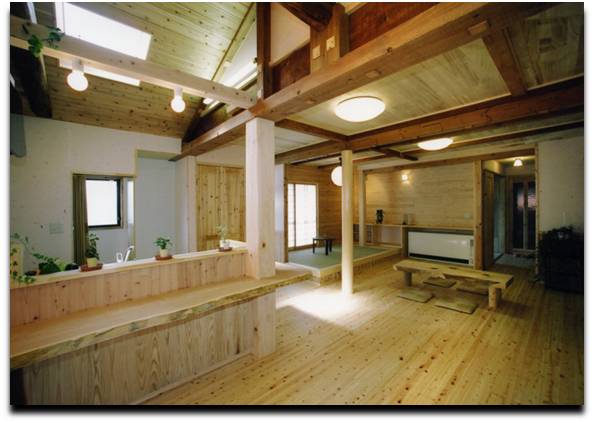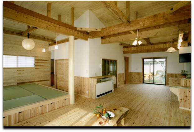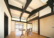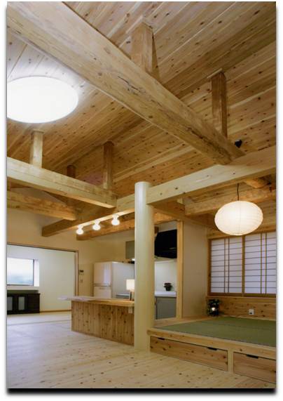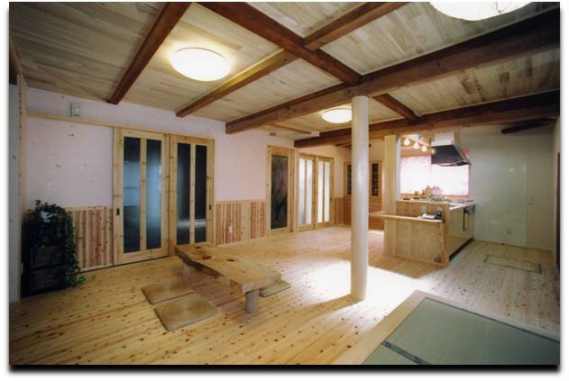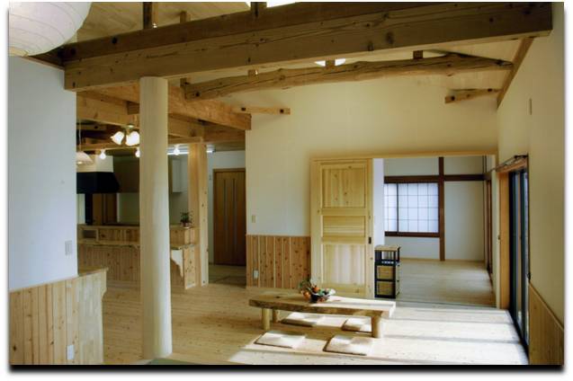 屋根裏に隠れていた丸太梁を出し、木の香り溢れる空間にしました。